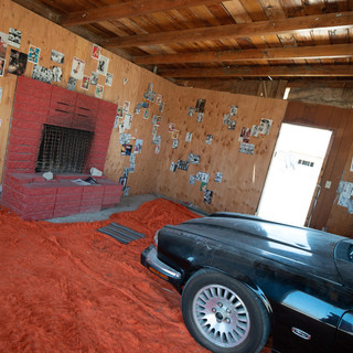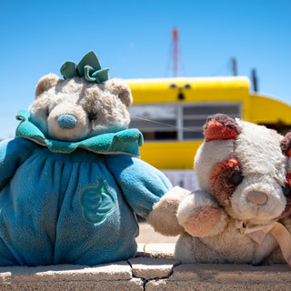 Outside the fading sea shores, it's dry, arid desert land. Just looking at it makes me thirsty. There are many strange things left behind: Trailers. Teddy Bears. Houses with cars inside. The good news is that I hear birds and see one random cat.